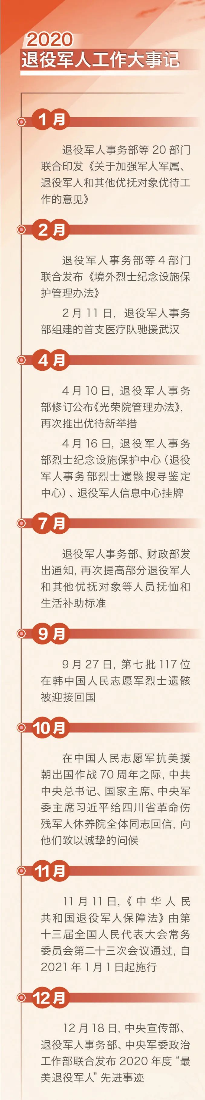 2020年,《境外烈士紀念設施保護管理辦法》、新修訂的《光榮院管理辦法》和《關於進一步推動撫卹優待政策落地見效的通知》等先後發佈印發。目前,中央層面已出台政策性文件52件,指導地方配套出台細化政策措施近600件,退役軍人工作政策制度體系建設加快推進。