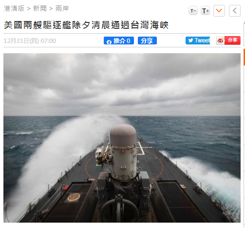 【環球網報道】據香港“東網”剛剛消息,美國兩艘驅逐艦今(31日)晨穿航台灣海峽。