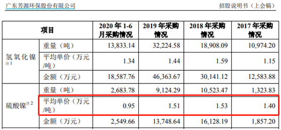 不僅如此,根據招股書顯示,MCC(中冶瑞木鎳鈷有限公司)是芳源股份的第一大供應商,2010年上半年芳源股份對該供應商的採購佔比高達62.31%,MCC也是中國五礦集團有限公司旗下公司。芳源股份向該供應商採購核心原材料硫酸鎳,招股書披露,芳源股份2018年和2019年採購硫酸鎳1.53萬元/噸和1.51萬元/噸。
