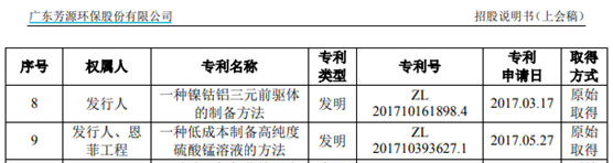 根據招股書披露,芳源股份在2017年申請的專利“一種低成本製備高純度硫酸錳溶液的方法”的權屬人為芳源股份和恩菲工程,而恩菲工程則是五礦集團下屬企業。