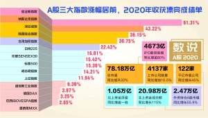 2020年,A股三大指數漲幅在全球主要市場中表現居前。其中,深市創業板指數大漲61.31%,高出第二位的納斯達克指數近20個百分點,大幅領跑全球主要指數;深證成指上漲36.15%,領先新興市場的韓國、印度、越南等地區指數,排名第三;上證指數上漲11.94%,排名第十。