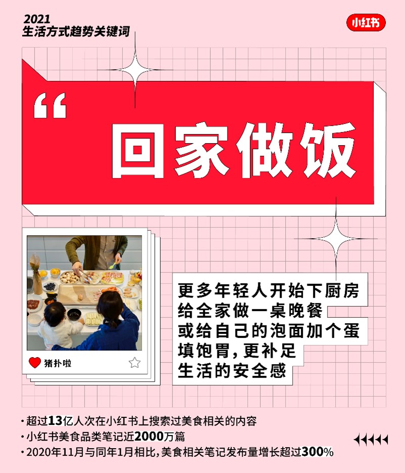數據顯示,2020年小紅書上運動健身和美食筆記的發佈量同比增長均超過了300%,2020年有超過13億人次在小紅書搜索過美食相關內容。