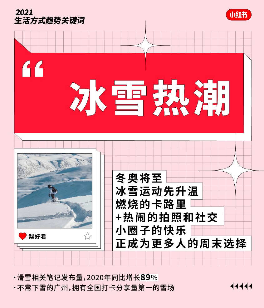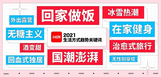 12月31日,生活方式社區小紅書發佈了《2021生活方式趨勢關鍵詞》,冰雪熱潮、無糖主義、酒變甜、回血式獨居、無性別穿搭、國潮澎湃、在家健身、治癒式旅行、外出露營、回家做飯等10個關鍵詞成為2021年的生活方式趨勢。