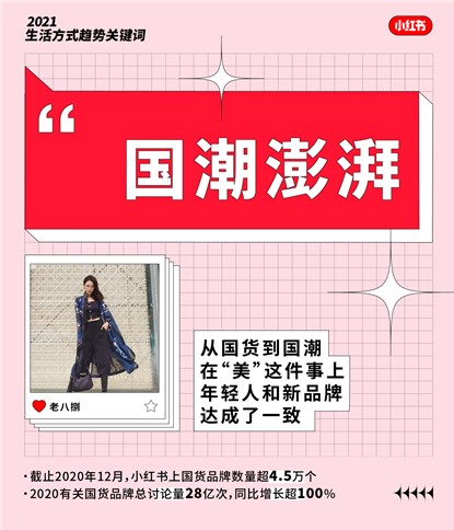 “穿什麼”除了關乎外表,更關乎價值主張的表達。從追捧國貨到追逐國潮,2020年,小紅書上共發生了28億次關於國貨品牌的討論和互動,同比增長超過100%。