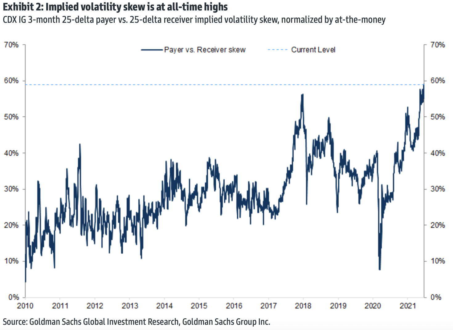 儘管目前還沒有任何事情能夠將信用利差從極低水平擺脱出來,但低隱含波動率並不一定意味着投資者心態過於樂觀。人們一直在強調一個事實,即股票市場的偏度——衡量看跌投注相對於看漲合同的昂貴程度的指標——一直接近歷史高位。然而,高盛指出,在企業信用市場也存在類似情況,即25-delta支付方和25-delta接收方的隱含波動率與平值合同之間的較大差距表明,“下行保護的相對價格從未如此昂貴過。”