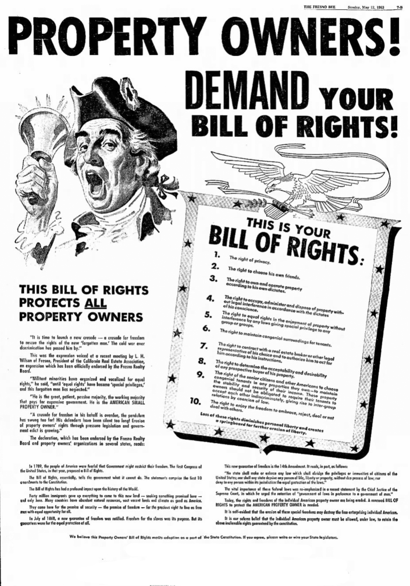 這則全頁廣告來自1963年的Fresno Bee,是房地產協會反對Rumford法案的一部分。由加利福尼亞房地產雜誌授權轉載,版權所有1963年加利福尼亞房地產經紀人協會,保留所有權利。有趣的地方在於倫理觀念。對於房地產經紀人來説,最基本的規則是努力消除房地產領域的欺詐行為,成為他們客户的忠實代理人,無論是賣方還是買方,並爭取最好的價格。[種族隔離] 完全違反了這兩個原則。
