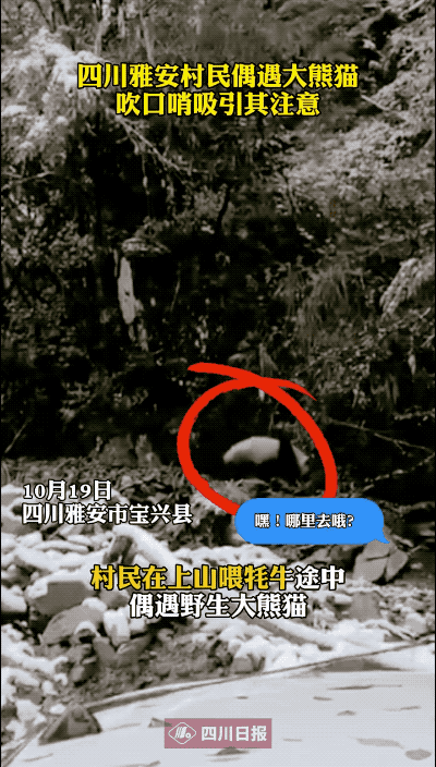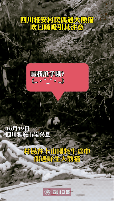 2020年10月19日,四川雅安市寶興縣嘎日村村民楊先生上山喂犛牛途中,偶遇了一隻野生大熊貓。