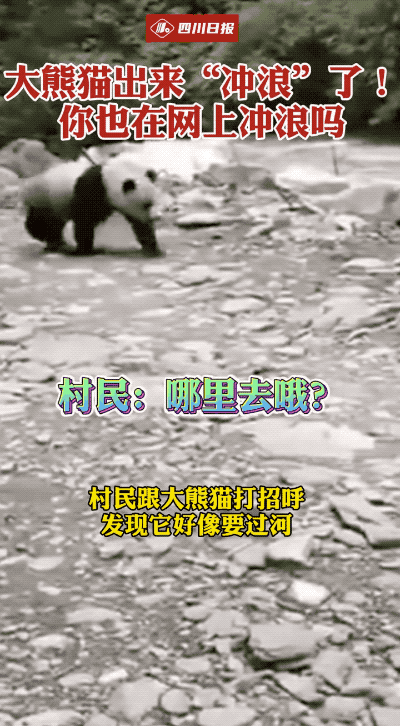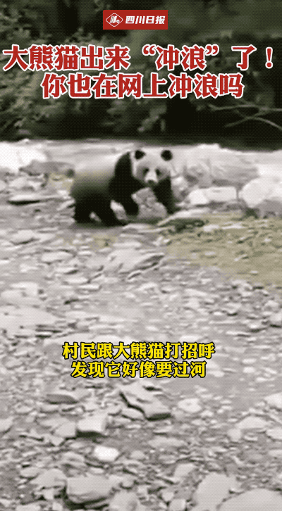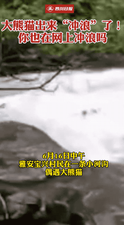 大熊貓在水流較為平緩的地方下水了,在水流較急的河中央,直接被衝到了對岸。