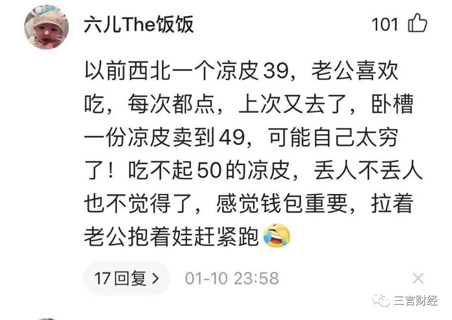 有網友稱以前一盤涼皮三十多塊,如今價格漲到49元錢。