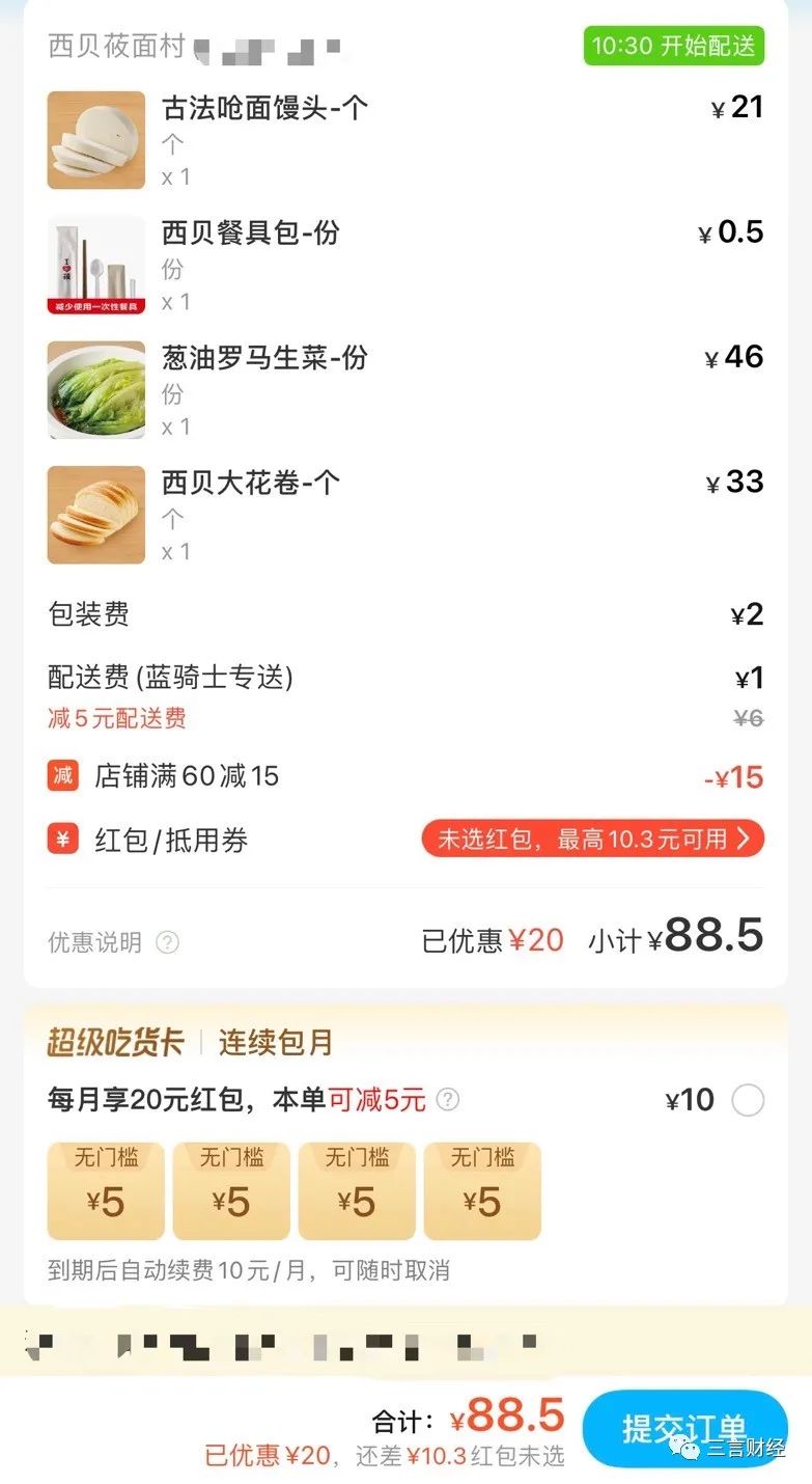 這可能是三言財經吃過最貴的外賣,即使平台優惠了20元,近90元的價格買一道菜、一個饅頭和一個花捲也真是心疼啊。