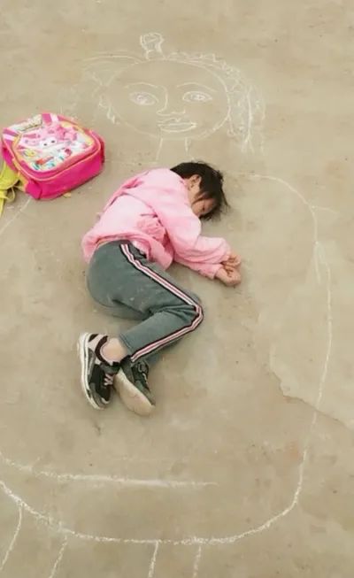 沒過幾天媽媽又離開,等待的日子裏實在想媽媽就照着樣子畫在地上,玩累了就躺在媽媽懷裏睡覺,那一刻她倍感温暖。
