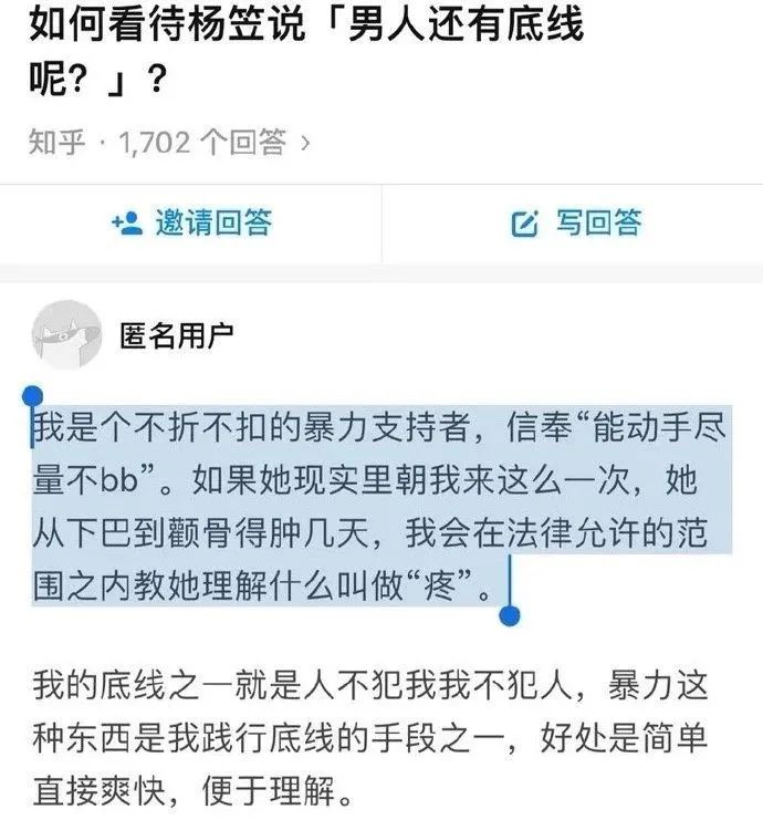 知乎網友的評論五花八門,層出不窮。但是這則匿名回答的帖子裏答主聲稱要用暴力對付楊笠,要讓她理解什麼叫做“疼”。
