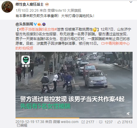 山東濟寧警方在一週之內先後接到3名女性報警,稱無故被一名男子腳踹、謾罵。警方調監控才發現,該男子當天一共作案4起,先後有5名女性被踹。在逆行闖紅燈時,因為被志願者制止,他還踹了志願者一腳才離開。