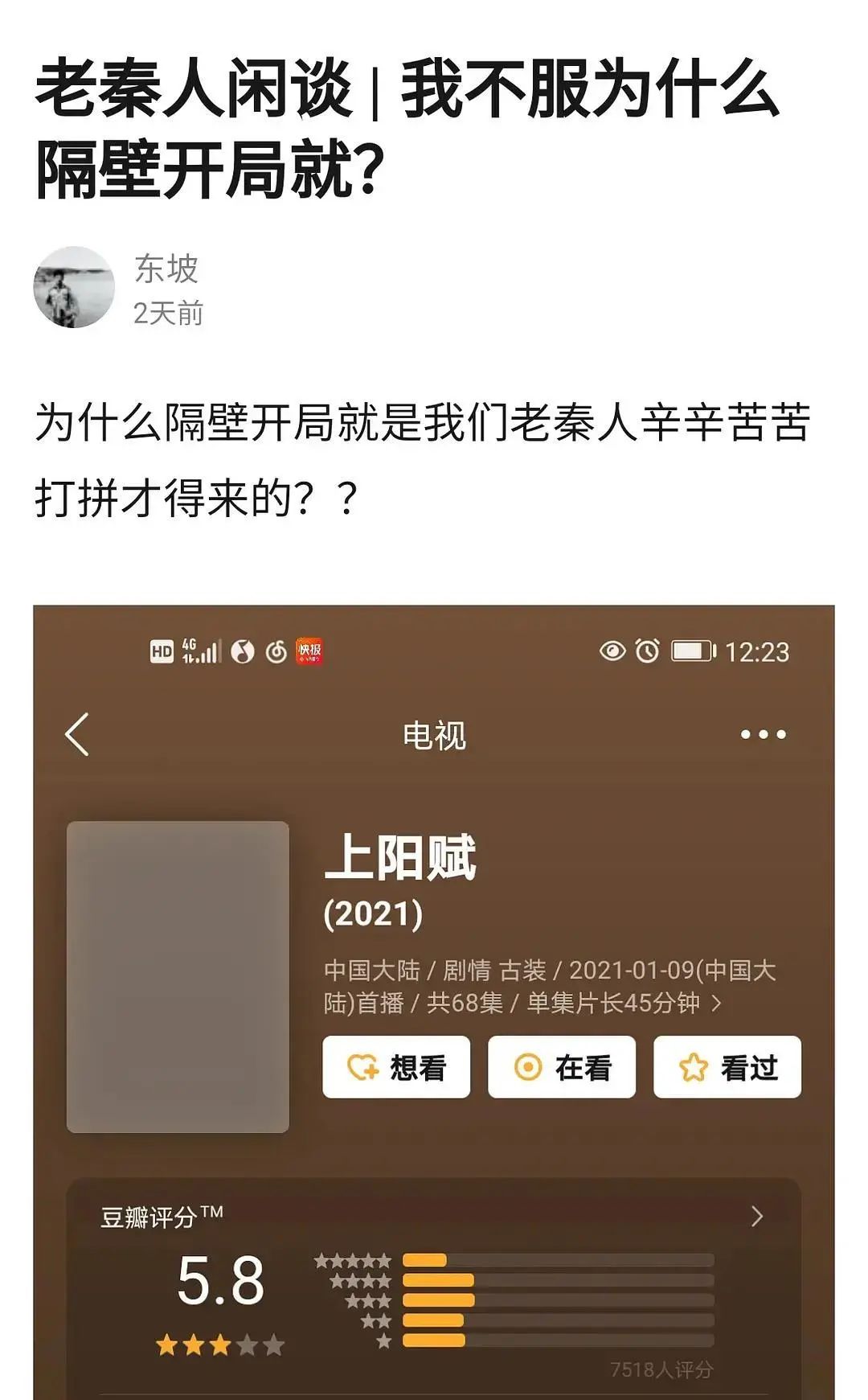 老秦人自黑自嘲,嫉妒《上陽賦》開局5.8,他們可是辛辛苦苦打拼《大秦賦》才拿到這個分數。