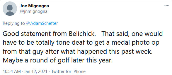 美國有線電視新聞網(CNN)13日報道稱,新英格蘭愛國者隊主教練比爾·貝里希克(Bill Belichick)近日被授予“總統自由獎章”,但他因為國會暴亂事件而拒絕“老朋友”特朗普為其頒發。