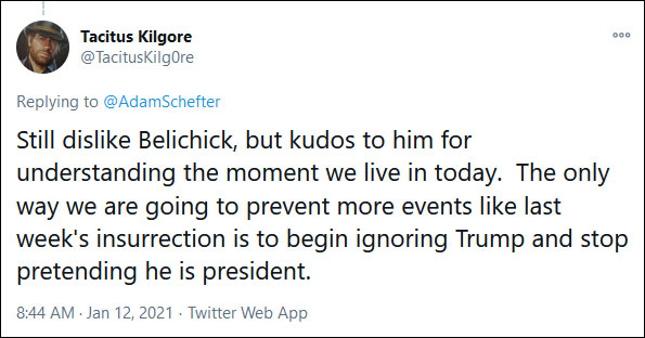 “雖然我還是不太喜歡貝里希克,但他有所意識還是值得肯定。避免上週事件再次發生的唯一解決方法就是,無視特朗普,同時不要再假裝他還是總統了。”