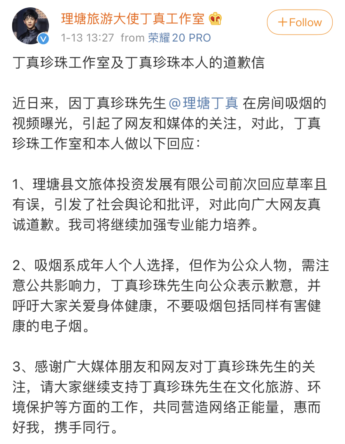 對此,丁真工作室官博1月13日正式發文道歉,稱此前回應草率且有誤,將加強專業能力培養;公眾人物需注意公共影響力,丁真向公眾表示歉意,並呼籲大家關愛身體健康。