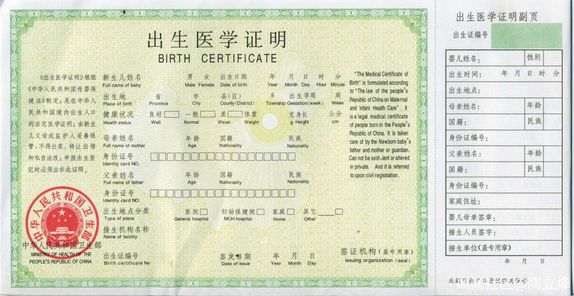1995年11月6日,依據《母嬰保健法》要求,原衞生部和公安部聯合發佈《關於統一規範〈出生醫學證明〉的通知》,規定自1996年1月1日起(邊遠地區3月1日起),出生的人口統一使用制發的《出生醫學證明》。