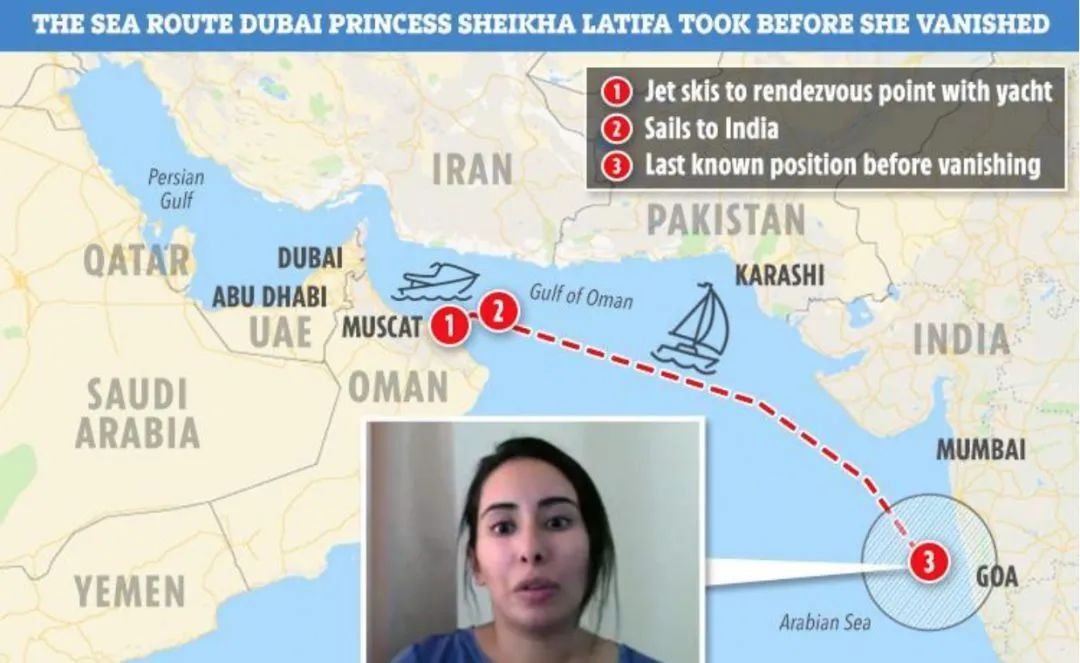 2018年,這位公主在法國和荷蘭友人的幫助下經阿曼逃離迪拜,打算乘遊艇經印度前往美國,卻在即將抵達印度,距離印度海岸80公里的海上,遭到印度軍艦和阿聯酋軍艦的攔截。然後,MARCOS登上游艇,抓走了拉蒂法,協助她逃跑的法國朋友若貝爾則被MARCOS打了滿臉花……