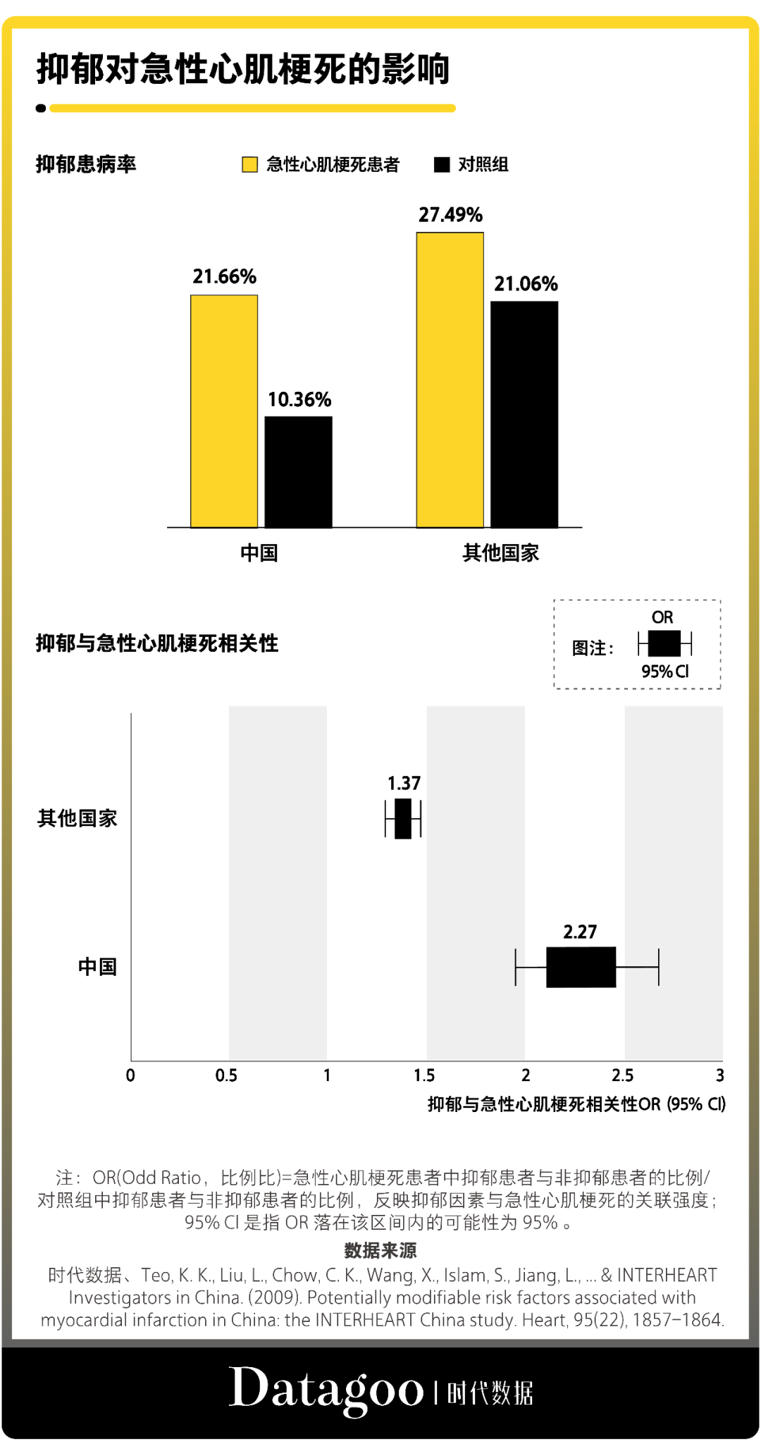 INTERHEART 研究發現,雖然中國急性心肌梗死患者和對照組的抑鬱患者低於世界均值,但拋卻失真等問題不談的話,中國急性心肌梗死患者抑鬱患病率則明顯高於對照組,且抑鬱與急性心肌梗死的相關性高於其他國家。