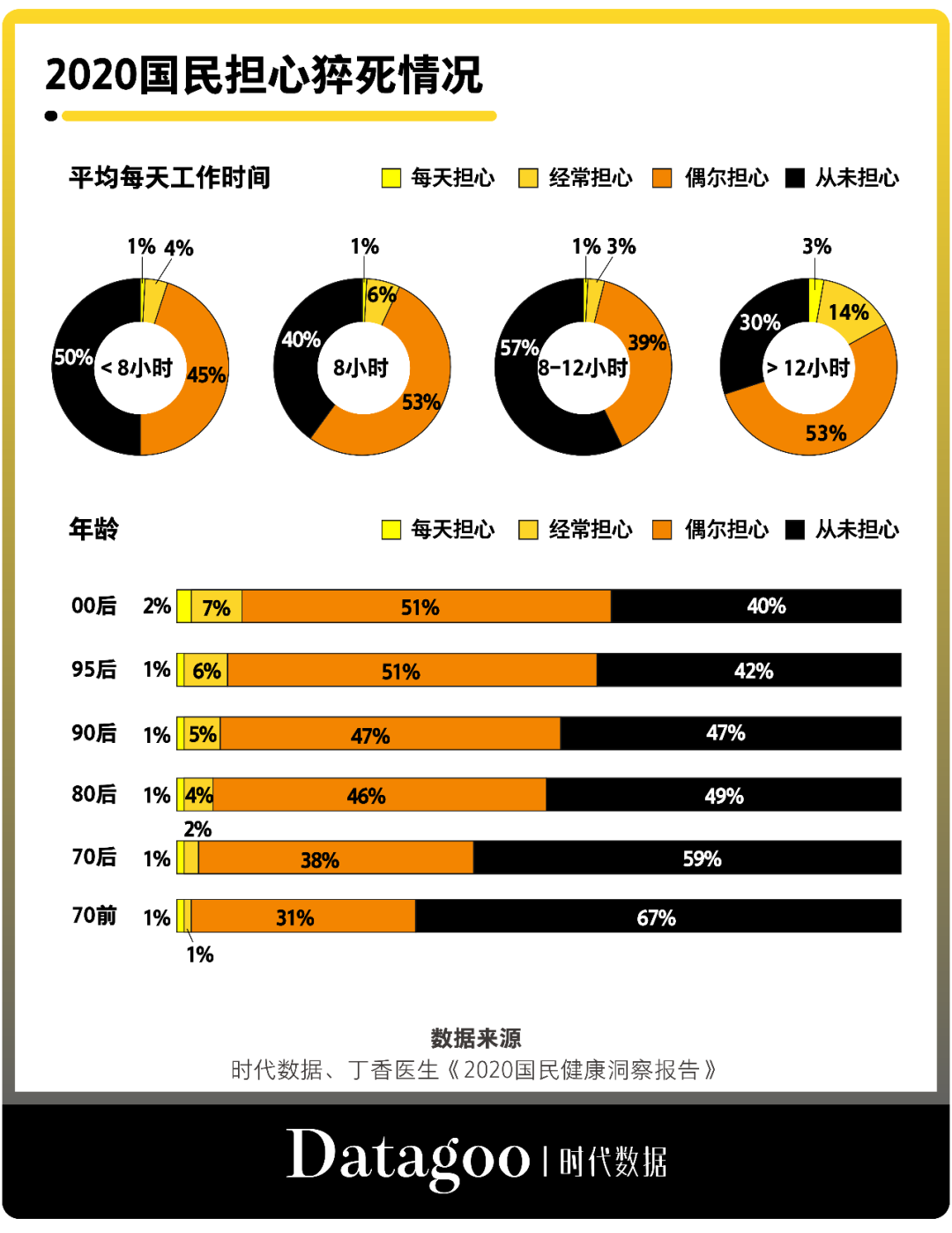 2020 年丁香醫生髮布的《國民健康洞察報告》顯示,越年輕,越容易擔心自己猝死。曾經擔心過自己猝死的 00 後佔到 60%,而 70 前這一比例僅為 33% 。