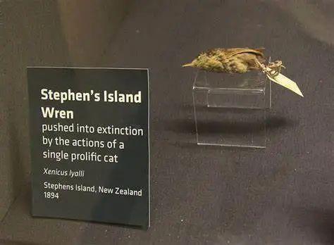 關於貓對物種的滅絕,最著名的應當是斯蒂芬島異鷯的故事:一隻名叫Tibbles的貓,僅在一年時間內就殺光了斯蒂芬島上所有的異鷯——一個島嶼特有種。