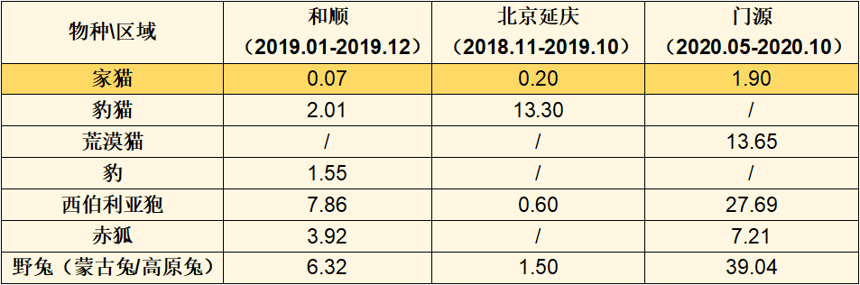 這裏的荒漠貓顯示出和北京豹貓非常接近的興旺態勢,RAI指數達到13.65。而這裏的家貓雖然多一些,但RAI指數也只是達到了1.90,與另外兩種生態位接近的食肉動物——荒漠貓和赤狐相差甚遠。