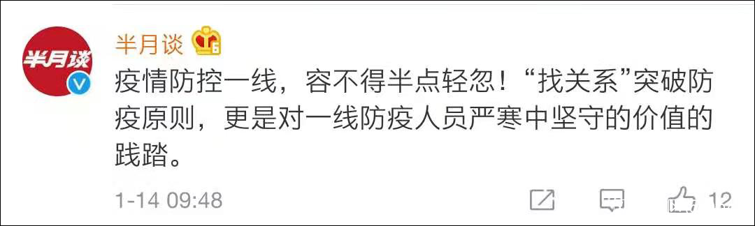 @半月談 評論稱:“‘找關係’突破防疫原則,是對一線防疫人員嚴寒中堅守的價值的踐踏。”