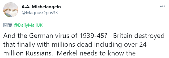 “那1939- 1945年的德國病毒呢?英國最終以數百萬人死亡的代價摧毀了它。”