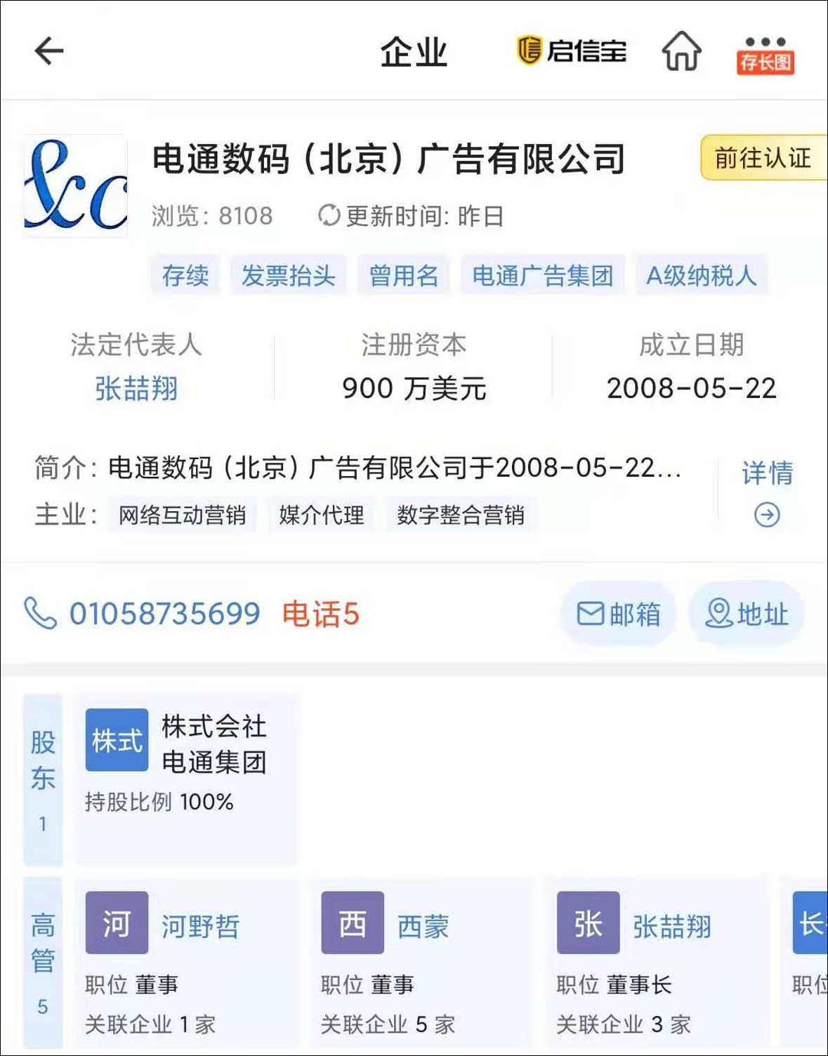啓信寶APP顯示,電通數碼(北京)廣告有限公司董事長、法定代表人為張喆翔,該公司屬於外國法人獨資有限責任公司,唯一股東為日本企業“株式會社電通集團”。
