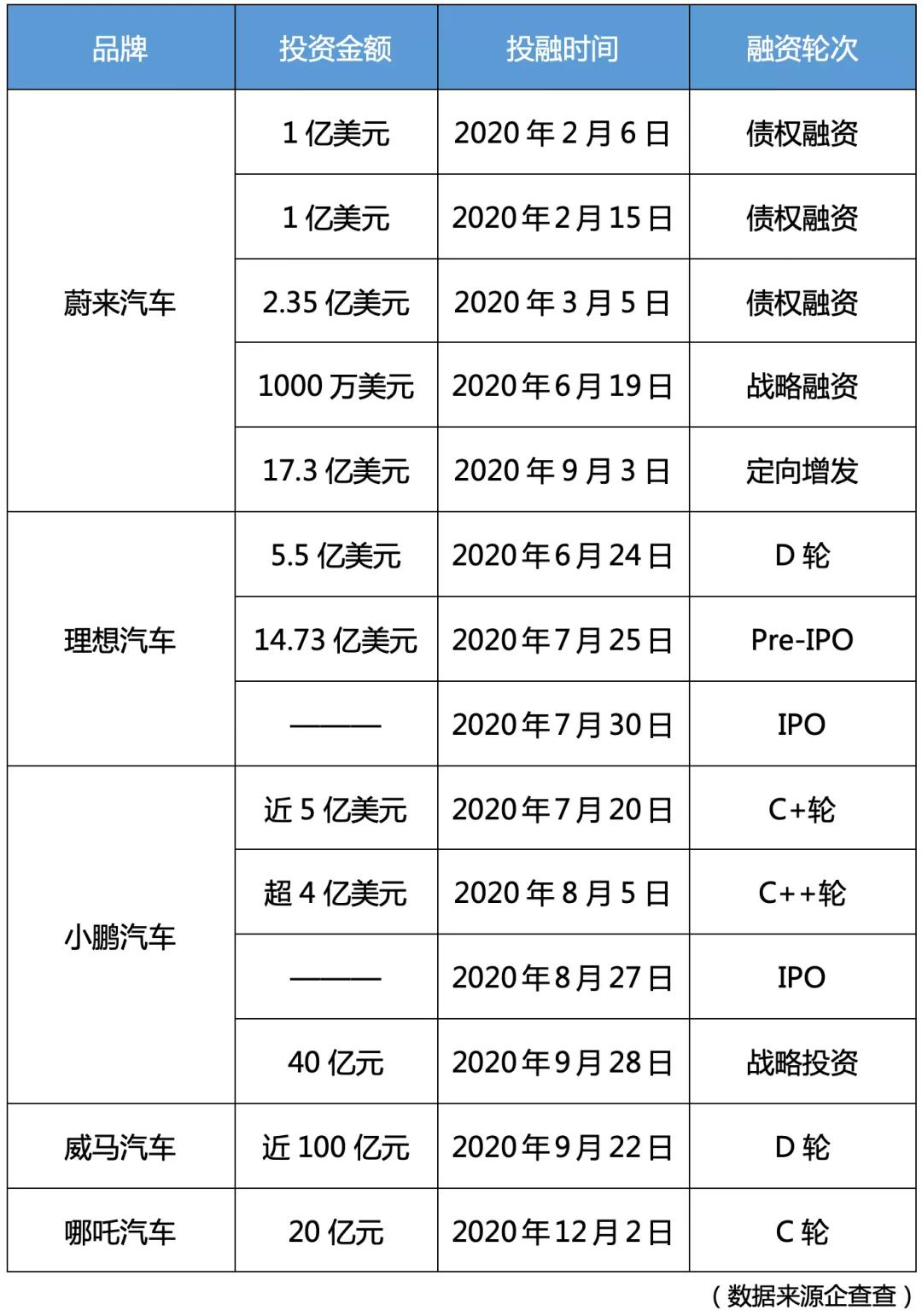 據趣識財經不完全統計,2020年蔚來汽車共融資5輪,融資金額超20億美元;理想汽車2輪融資超20億美元;小鵬汽車3輪融資近10億美元;而威馬汽車更是由政府領投超100億元。