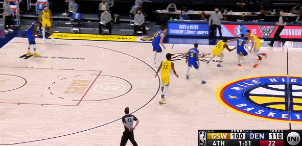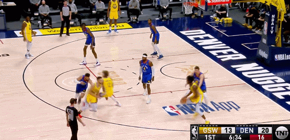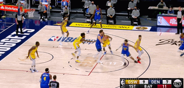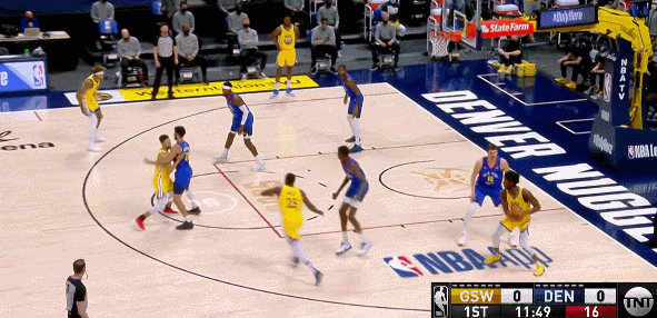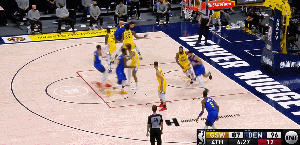 之後庫裏提前回來,掘金還是繼續夾擊,庫裏出球,剩下的就看隊友們以何種方式打鐵了。