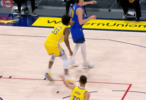 所以到第一節6分多鐘的時候,馬龍教練覺得情況不太對了。6分32秒,勇士打了一個和開局一模一樣的戰術,這一下子約老師直接到外線和穆雷對庫裏形成了夾擊,庫裏傳給烏佈雷命中了他本場的第一記三分。