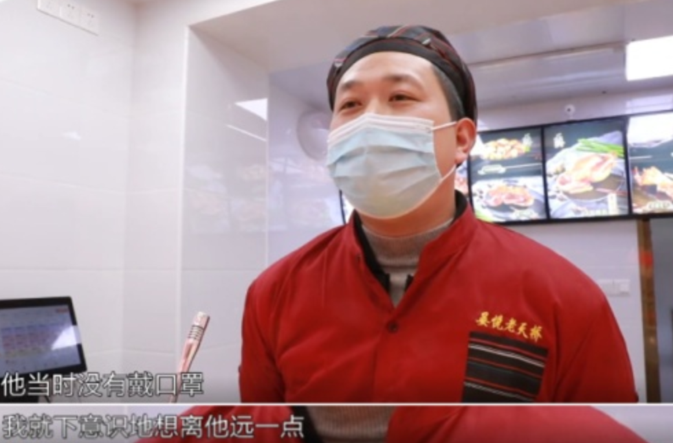 記者還採訪了東四北大街上的幾家商户,當他問熟食攤老闆生意好不好做,老闆嘴裏説着“還可以”,順便不動聲色地往後退了一步,因為這個英國人沒有戴口罩。