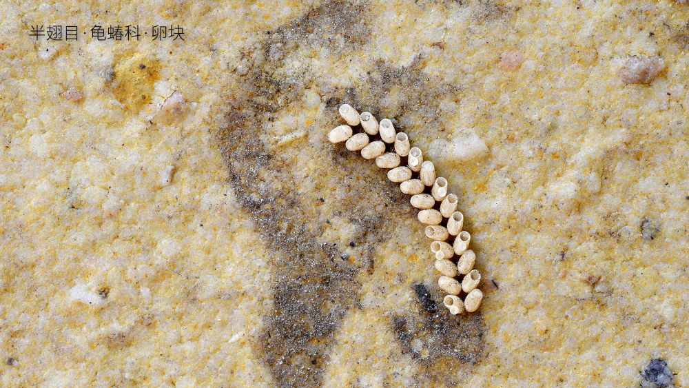 這個像徽章裏的麥穗一樣排列的龜蝽卵,就是在我家樓下的牆上,當然大多數卵塊沒有這麼好看,它們堆積得比較鬆散或者簡單。這位母親,很明顯它擁有極高的美學修養,它用對稱排列的26枚卵拼成了一段優美的弧形。