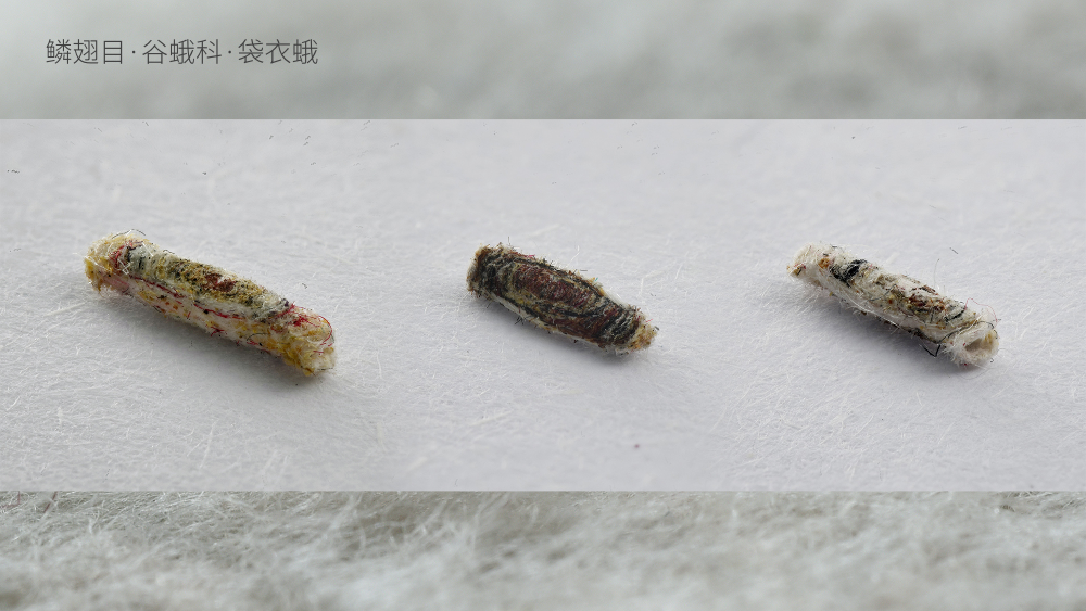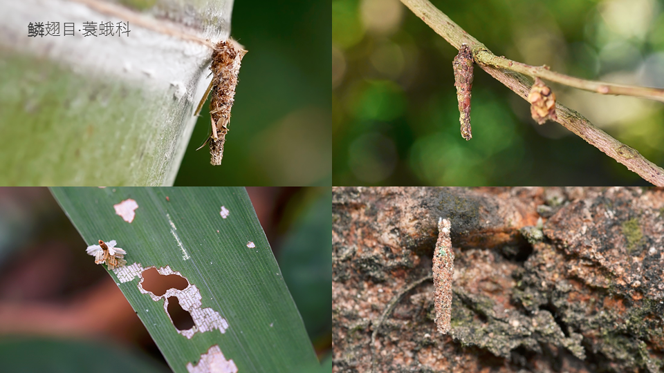另外一類叫做蓑蛾的昆蟲,它們也會收集一些材料,做成一個可以移動的房子,整天揹着走。