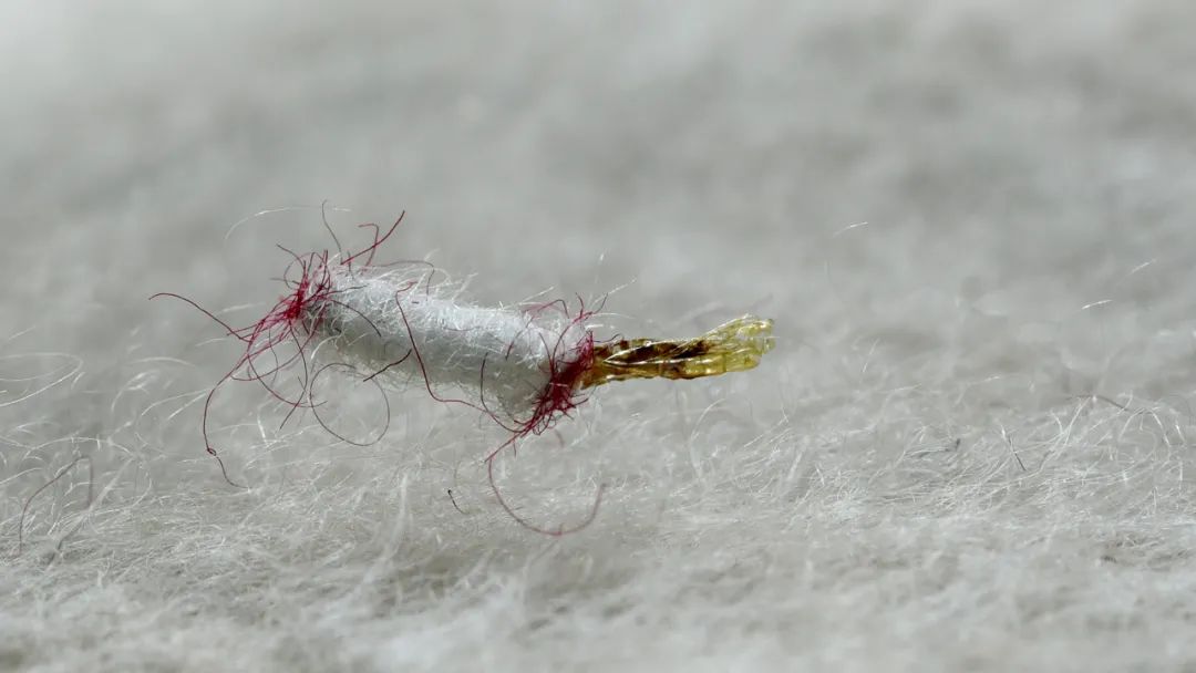 我知道在幾個月前,它從上面的一件紅毛衣那裏扯了一些絲,衣蛾的口袋跟蓑蛾有個區別,就是它兩端都開口,它現在用紅毛線把這個堵住,然後在裏面化蛹,羽化成蛾子就飛走了,這個黃色的是它留下的蛹殼。