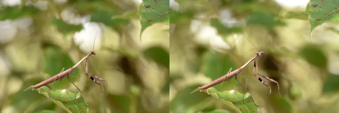 我們看這是螳螂,這是我拍到的,它當時正在趕路,它看到我了,它在身體不動的情況下,頭轉了90度過來看我。蟻蛛説,我是做不到的,我只能轉身,不能轉頭。如果你想體會一下蟻蛛的感覺,想想有的時候我們晚上沒有睡好,脖子落枕了……