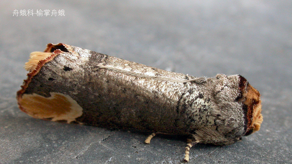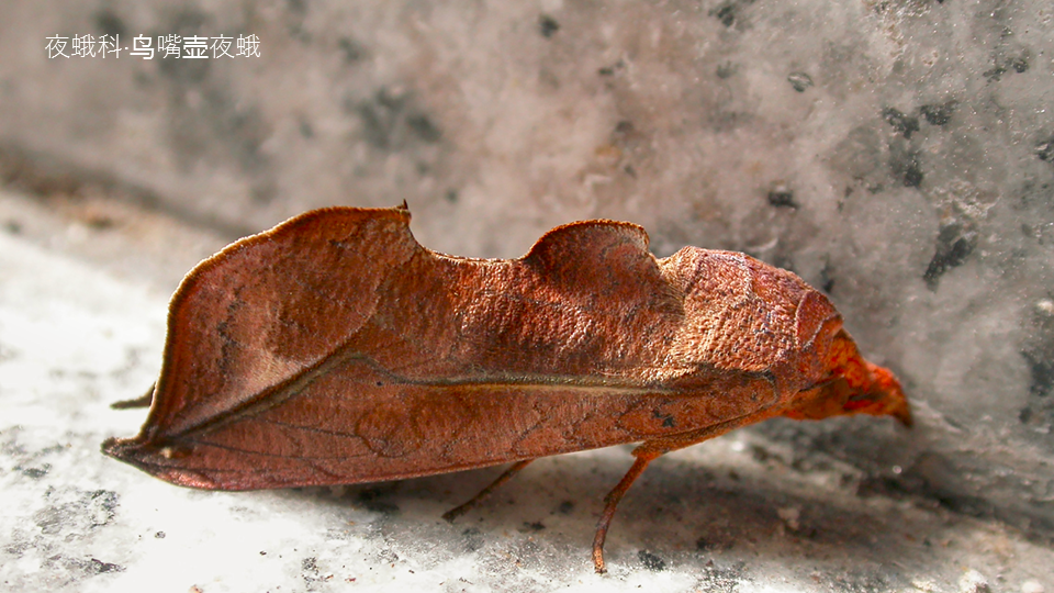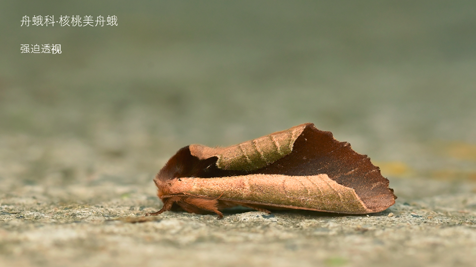 我最喜歡的一隻蛾子叫做核桃美舟蛾,從側面看它就是一片捲曲的枯葉,其實它只是在自己的翅膀上打印了一幅卷葉的照片。我們看到那些靠後的部分其實是深色的鱗片,因為它的對比非常的強烈,所以真實感就出來了。這種策略叫做強迫透視,它只能在正側面才有效。