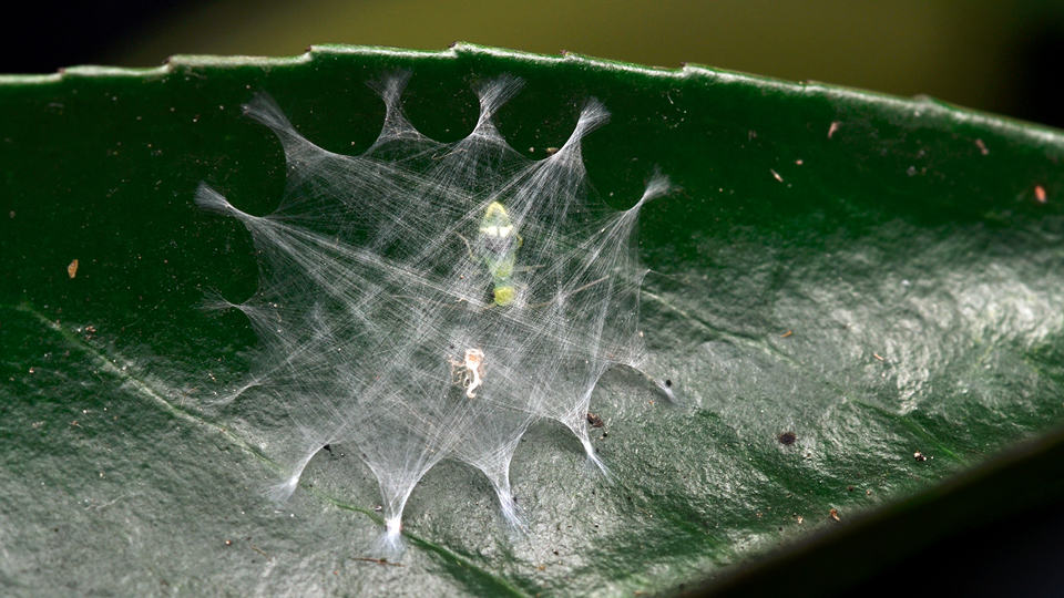 我湊近一看,這不就是一個拉索結構的帳篷嗎?一種叫做齧蟲的小蟲它完成了這個作品,它首先找一個捲曲的葉子,然後在上面拉一個平面,這個絲巢就做好了。