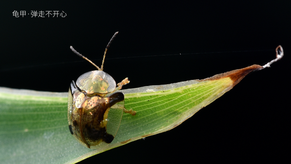 它會把腿和觸角都收起來,底盤一下降到零,就防止螞蟻從邊上把它撬起來,它抓握的力量非常的大,它的胸背板和鞘翅邊緣都是透明的,這個非常的重要,當它處於防守姿態的時候,可以從容地看一看這個螞蟻,久攻不下以後,它們是真的走了,還是要耍一招引蛇出洞呢。我們可以試想有一隻自信而又樂觀的龜甲,當它的敵人為了吃它的肉,在外面兇狠叫囂的時候,它淡定悠然,隔窗觀山河秀麗。