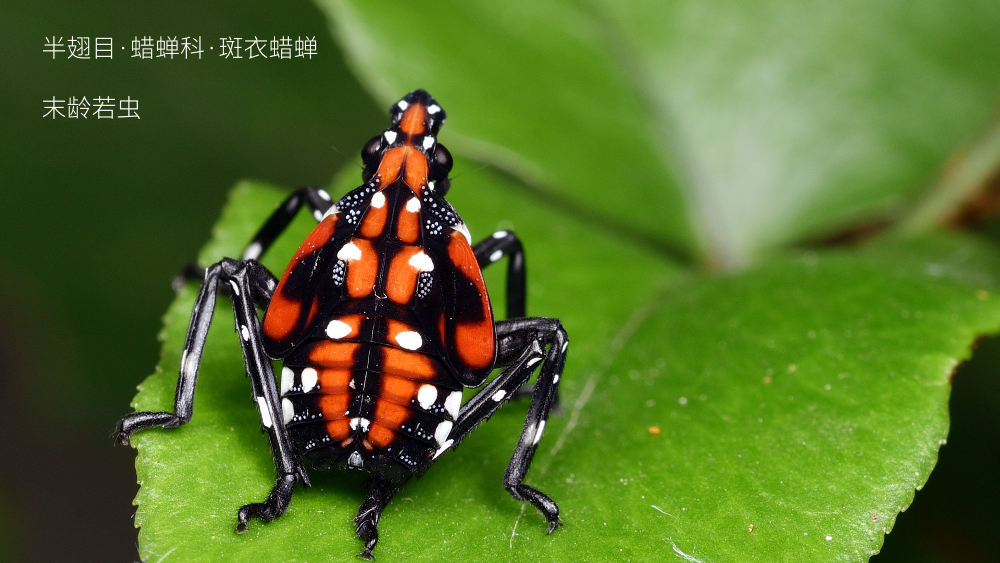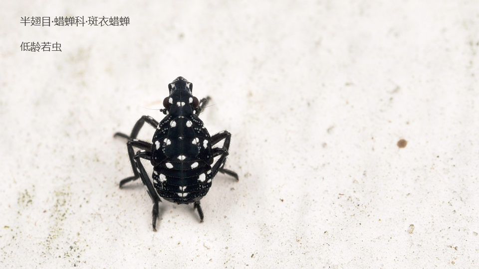 在斑點外衣的昆蟲裏面,我最喜歡的是這個,斑衣蠟蟬的小的若蟲。我們可以看到,在它的背上,其實有一張唐朝美女的臉,如果有朋友還沒有看出來的話,我其實還做了一個提示。