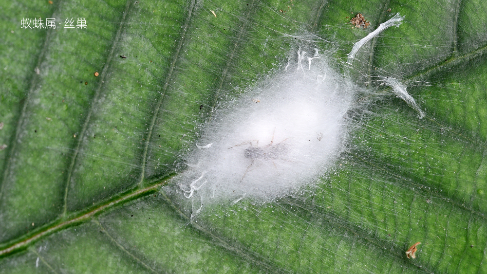 我們在葉子上經常見到的這種絲巢,有很大的可能就是蟻蛛的。我以前經常想,如果下輩子成為一隻蟲子,那我選擇什麼好呢?我想蟻蛛也不錯,因為作為擬態螞蟻的蟲子天敵比較少,沒有什麼可擔心的。夏天我可以織一牀夏涼被蓋在身上,冬天我把這個被子織得厚一點,沒事的時候到門口去捉點蟲子吃,天氣不好我就宅在家裏,日子一天天的就這樣過去了,唯一不好的地方就是:永遠落枕。
