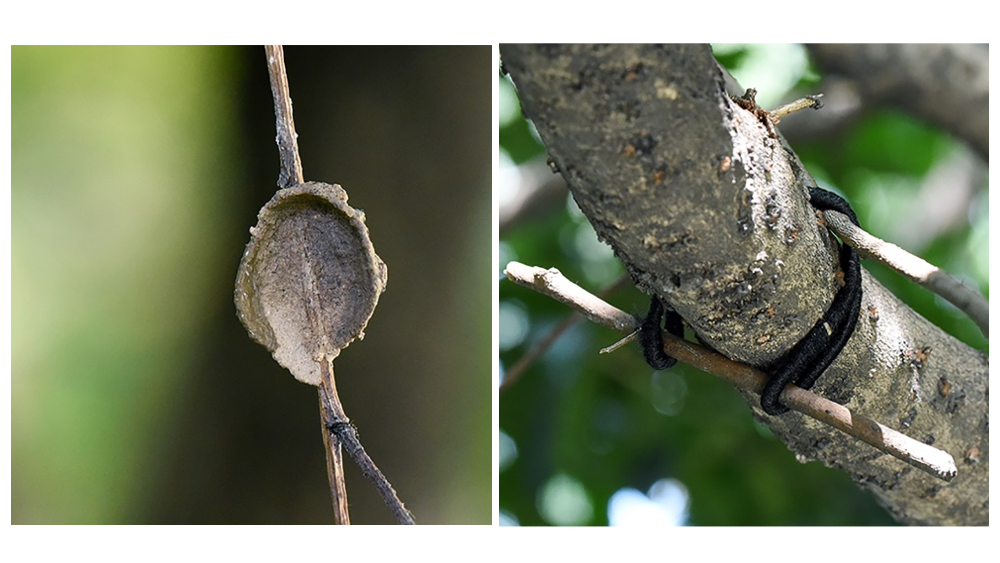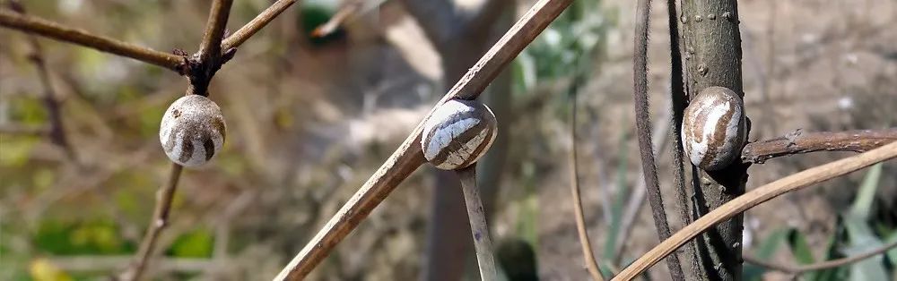 經常見的是它的繭,它的繭出現在小樹枝上,褐白相間,像一個小西瓜。 我們古人觀察到雀鳥會啄開這個西瓜,然後掏裏面的蟲子吃,就好像這是它的飯缸子一樣,所以管它叫做雀甕。