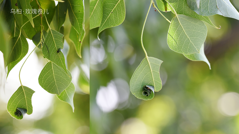 這個是烏桕葉上,像一朵綠色的玫瑰花一樣的,我到目前為止只知道它是某一種蛾子的幼蟲,把它捲成這個樣子,因為它的邊上還有一些半成品,所以我們很容易猜測出它的製作過程,就是從右上角開始,裁一條S型的曲線,一邊裁一邊卷。