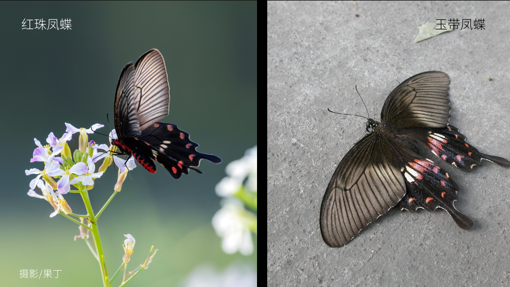 舉一個例子,這兩隻蝴蝶看起來非常的相似,但是左邊的這隻紅珠鳳蝶它是有毒的,鳥不會吃它,所以右邊玉帶鳳蝶的雌蝶就通過模仿它,來獲得自己生存上的好處。