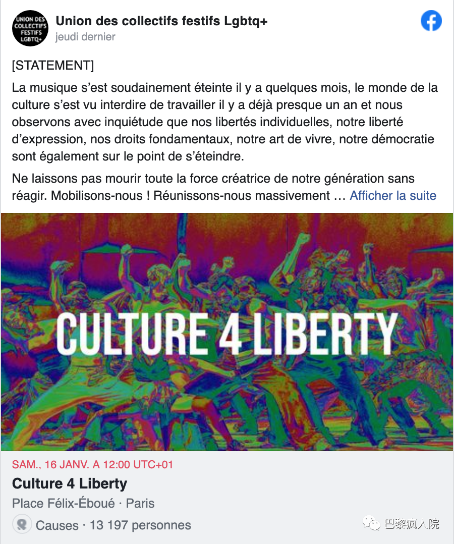 將在本週六舉行全國範圍內的大型示威遊行活動“Culture4Liberty”,呼籲法國人民動員起來,反對系統地長期關閉文化場所,“不要讓我們這一代人所有的創造之力在沒有行動下死去”。