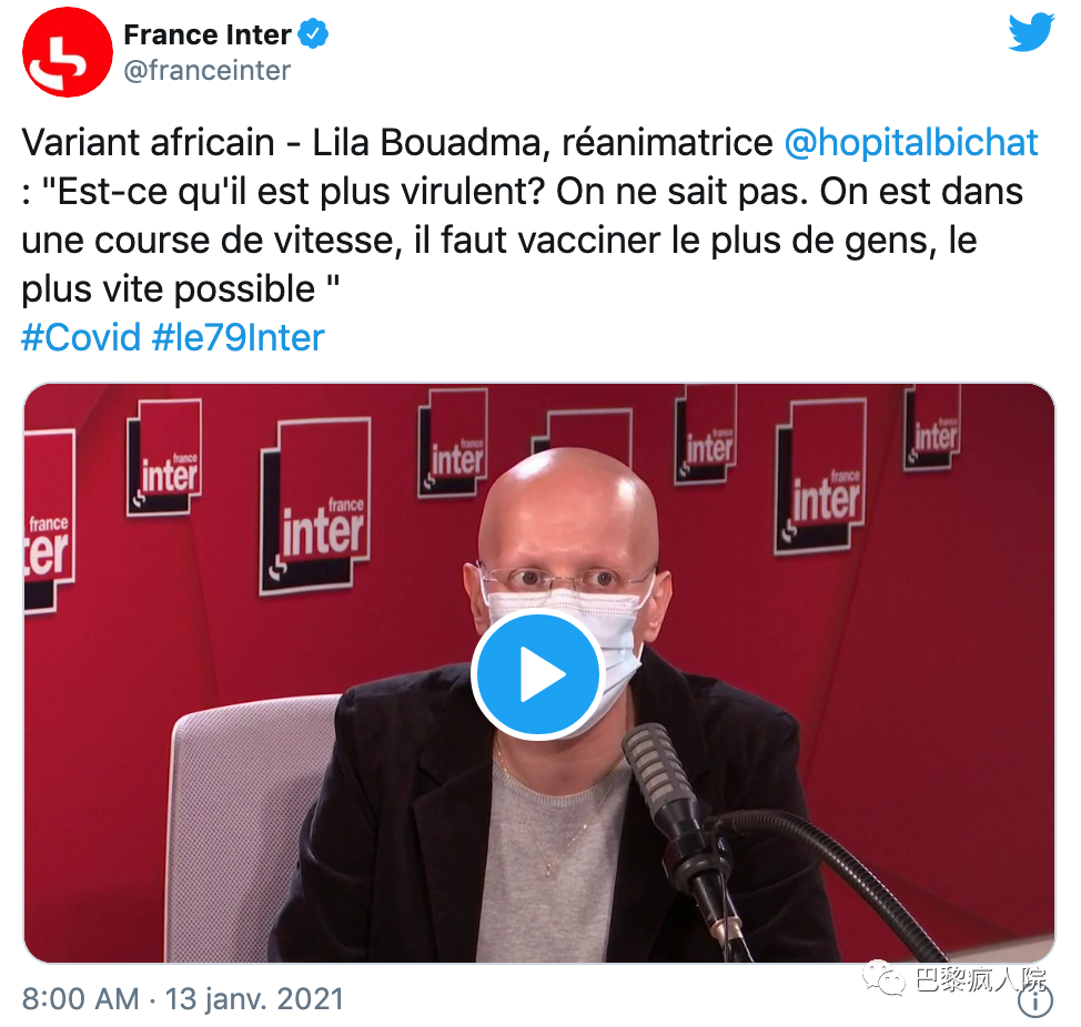 科學委員會主席也擔心這種變異比英國的變種“毒性更大一些”。巴黎Bichat醫院重症醫師Lila Bouadma週三在France Inter上説:“我們正在進行一場速度賽,所以我們需要儘快為儘可能多的人接種疫苗。”