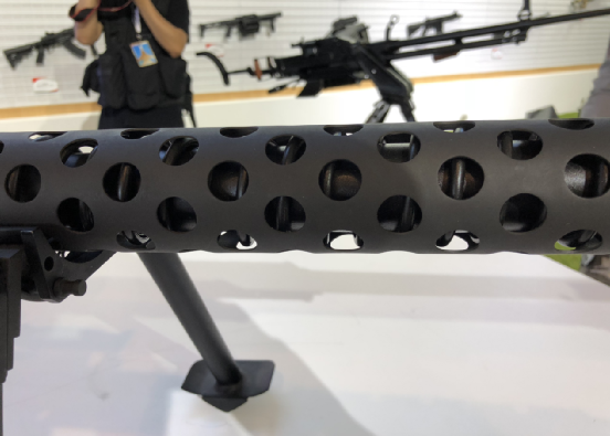 這種反器材步槍的槍管浮置,被散熱筒包裹,散熱筒上佈滿圓孔,可以幫助槍管高效散熱,兩腳架也固定在了散熱筒上,並不接觸槍管。