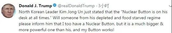 2018年1月2日,特朗普在社交網絡上向朝鮮喊話稱:朝鮮領導人説他桌上有核按鈕,麻煩請轉告他,“核按鈕我也有,比他的更大、更厲害,而且真的有用!”